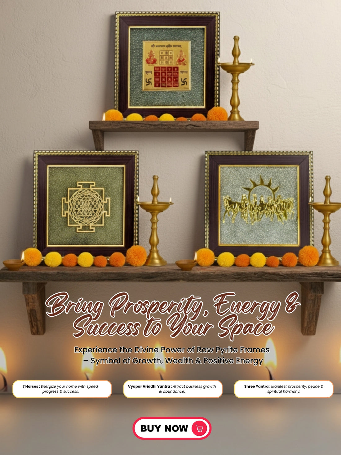 - Premium Material & Finish: Our items, such as the 7 Running Horses, are presented on genuine raw Pyrite frames, not just standard prints or synthetic stones. Pyrite is known for its strong wealth-attracting energy, making the frame itself a powerful Vastu element.
